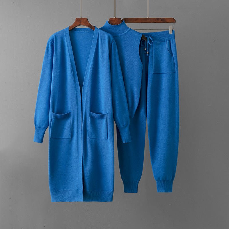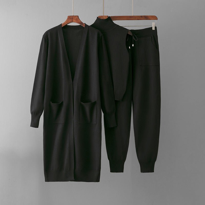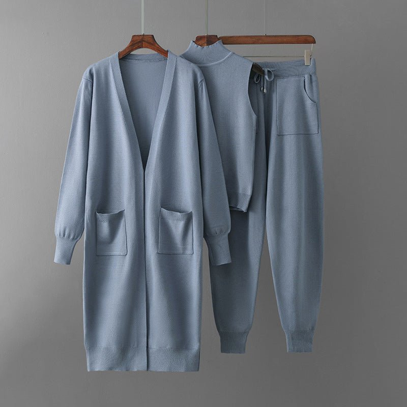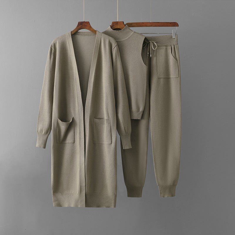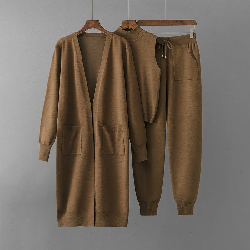 Set includes: Cozy cardigan, sleek vest, and cropped pants.